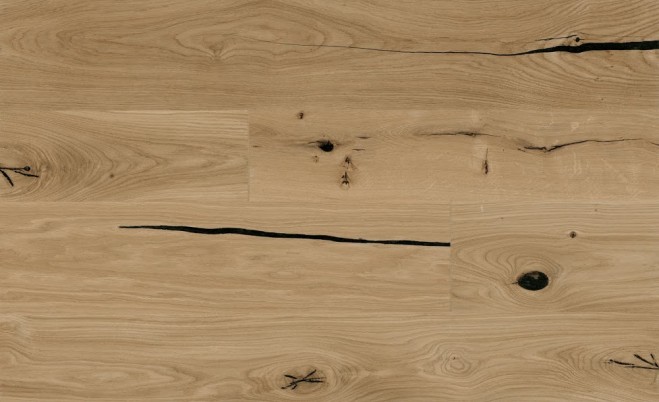 Je hrastov parket z izbranim videzom rumenkasto rjavega tena. Površina je krtačena, z beljavo in velikimi grčami, ter z za hrast netipičnimi razpokami, ki so zapolnjene s črnim polnilom, ravno tako kot grče. Za končno oljenje je izbrano transparentno ECO olje.